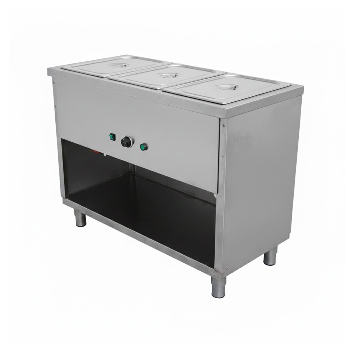 Calentamiento Ultra Rápido y Uniforme: Gracias a sus 3 potentes resistencias eléctricas tipo espiral (1200\W cada una), el equipo alcanza la temperatura de trabajo en tiempo récord. La distribución del calor es constante en los tres depósitos, eliminando puntos fríos que puedan comprometer la seguridad alimentaria.