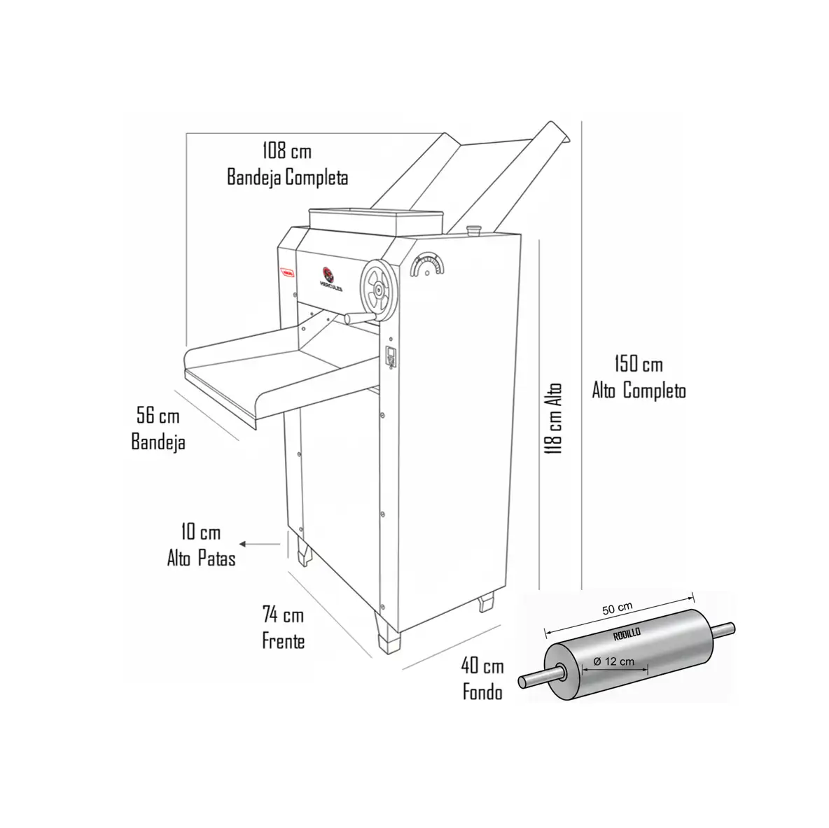 La Sobadora YM500 «Hércules» de Maigas hace honor a su nombre. Equipada con una potencia extraordinaria de 3.2 HP, es una de las máquinas más robustas de su categoría, diseñada para adelgazar masas de panadería con firmeza y precisión.