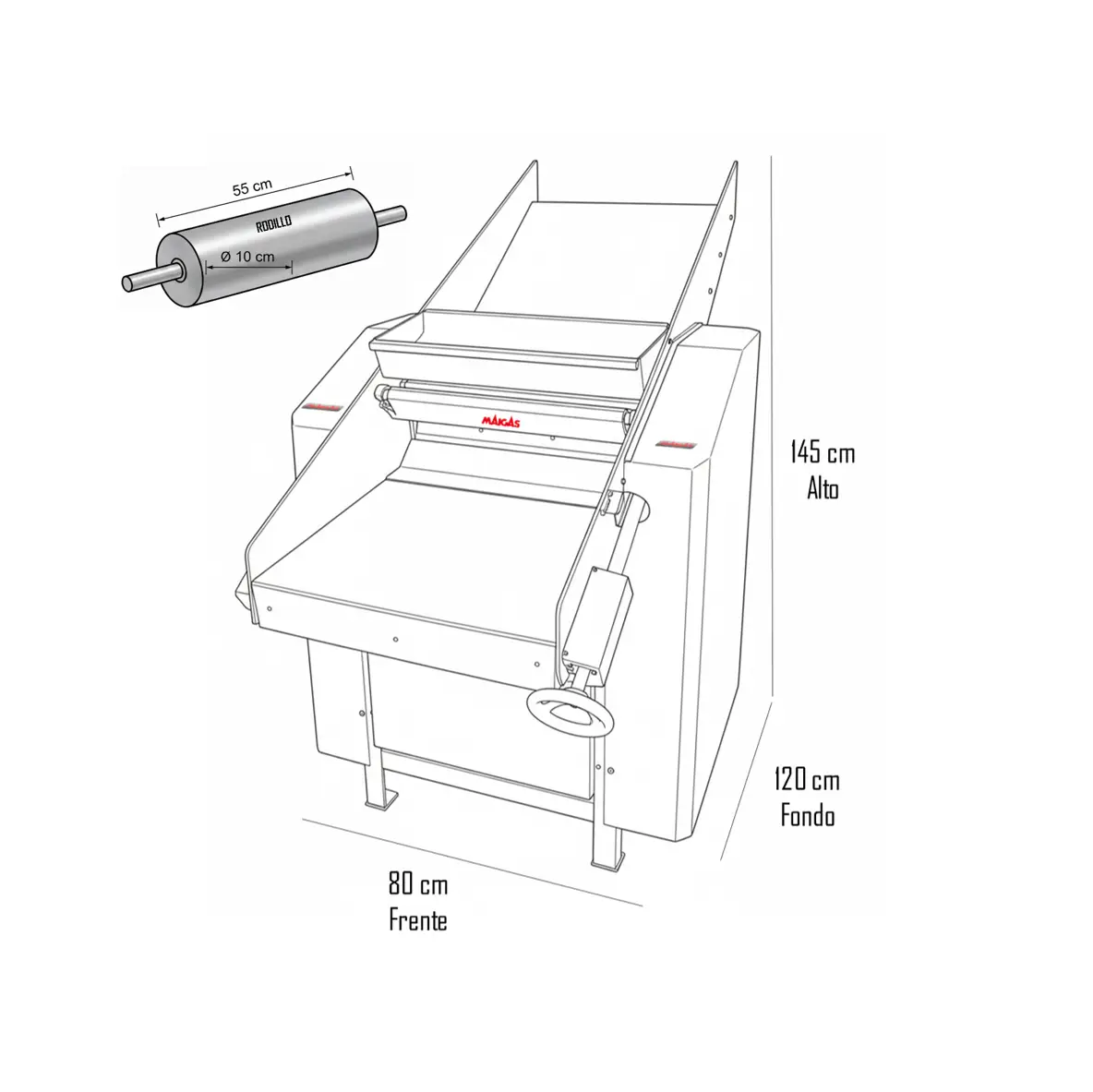 La Sobadora Maigas de 55 cm destaca por su versatilidad y potencia. Con un motor de 3 HP y un rodillo de 550 mm, permite trabajar piezas de masa más grandes en cada pasada, ideal para extender bases de empanadas masivas o sobar grandes cantidades de masa de pan.