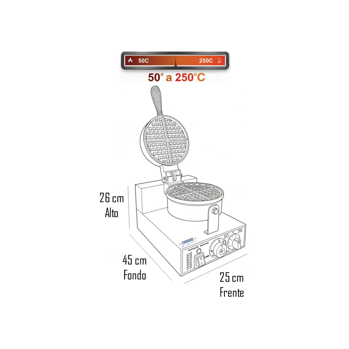| Control de Temperatura Preciso: Su termostato regulable (de 50°C a 250°C) permite ajustar el nivel de dorado exacto según su receta, desde wafles suaves hasta los más crujientes. |